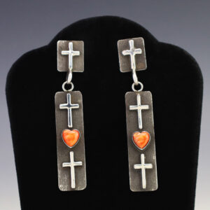 Gorgeous heart earrings hand made out of sterling silver and Spiny Oyster by Navajo silversmith Ernest Rangel. These wonderful earrings will become a versatile accessory in your jewelry collection. Weighs 14 grams. Signed 1/2″ x 2 15/16″ Artist card included The Navajos began working with silver in...
