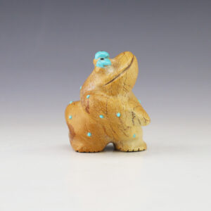 Zuni fetish artist Delvin Leekya comes from a family of carvers, and he is the grandson of Leekya Deyuse. Delvin continues to create traditional fetishes in the style of his famous grandfather. This outstanding bear is made out of Travertine (Zuni Rock) and is bundled with Turquoise and Abalone. Zuni...