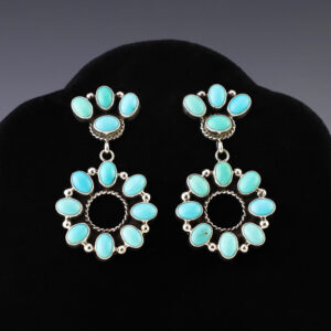 Beautiful earrings made out of sterling silver and Turquoise by Miranda James. These fabulous earrings will become a versatile accessory in your jewelry collection. Weighs 8 grams. Signed 1″ x 1 1/4″ 1 7/8″ long (including ear wires) Artist card included The Navajos began...