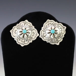 Beautiful earrings hand made out of sterling silver and Turquoise. Hand made by Navajo silversmith Jennie Blackgoat. These fabulous earrings will become a versatile accessory in your jewelry collection. Weighs 10 grams. 1 7/16″ x 1 7/16″ Artist card included The Navajos began working with silver in...
