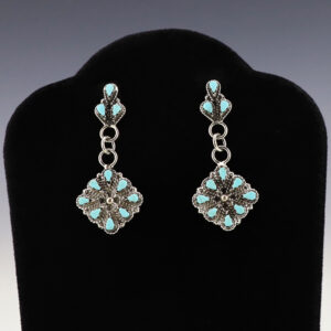 Gorgeous dangle earrings made out of sterling silver and set with Prince Turquoise stones. These fabulous earrings will become a versatile accessory in your jewelry collection. Weighs 6 grams. Signed 11/16″ x 11/16″ The Navajos began working with silver in the 19th century, and began making things like...
