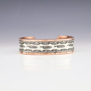 Navajo artists Randy Secatero and Sylvana Apache made this marvelous bracelet. Sterling silver and Copper with a traditional hand stamped design. Weighs 44 grams. The entire inner circumference is about 7 1/4”, including 1 1/8” opening. (Fits a 7 1/4″ wrist) Signed 3/8″ wide Artist card included ...