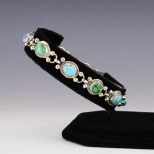 This timeless piece would be a great addition to your jewelry collection. Sterling silver with Golden Hills and Sonoran Gold Turquoise stones. The link bracelet is 7 1/2″ to 8 1/2″ long. Weighs 20 grams. Signed. 7/16” wide The Navajos began working with silver in the...