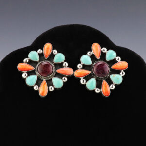 Beautiful earrings hand made out of sterling silver, Spiny Oyster, and Turquoise. Hand made by Navajo artist Ella Linkin. These fabulous earrings will become a versatile accessory in your jewelry collection. Weighs 18 grams. Signed 1 3/8″ x 1 3/8″ Artist card included The Navajos...