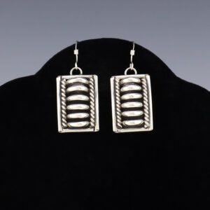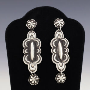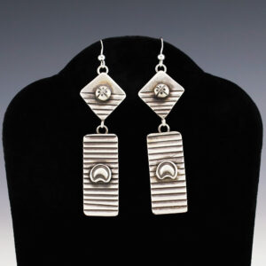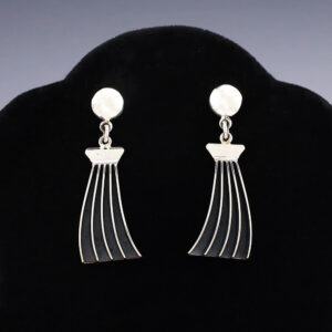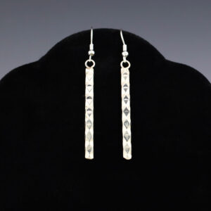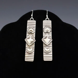 Outstanding dangle earrings hand made out of sterling silver by Navajo silversmith Dakota Willie. These fabulous earrings will become a versatile accessory in your jewelry collection. Weighs 10 grams. Signed 1/2″ x 2 1/4″ 2 11/16″ long (including ear wires) Artist card included The Navajos began working...