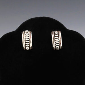 Navajo artist Landon Secatero made these lovely hoop earrings out of sterling silver. Great hand stamped design. These earrings will become a versatile accessory in your jewelry collection. Weighs 6 grams. Signed 3/8″ x 7/8″ Artist card included The Navajos began working with silver in the 19th century, and began...