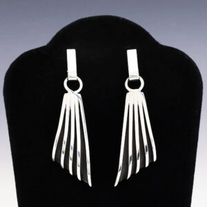 Outstanding dangle earrings hand made out of sterling silver by Navajo silversmith Dakota Willie. These fabulous earrings will become a versatile accessory in your jewelry collection. Weighs 12 grams. Signed 7/16″ x 2 1/16″ 2 9/16″ long (including ear wires) Artist card included The Navajos began working...