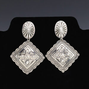 Lovely earrings hand made out of sterling silver with a stamped design and a satin finish. These fabulous earrings will become a versatile accessory in your jewelry collection. Weighs 8 grams. Signed. 3/4″ x 3/4″ 1 3/8″ long (including ear wires) The Navajos began working with silver in...