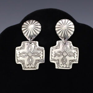 Beautiful cross earrings hand made out of sterling silver. The earrings have a hand stamped design and satin finish. Hand made by Navajo silversmith Vincent Platero. These fabulous earrings will become a versatile accessory in your jewelry collection. Weighs 10 grams. Signed. 1 1/16 x 1 15/16″ Artist...