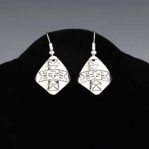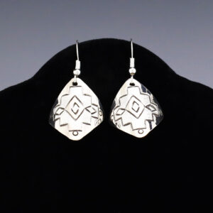Marvelous earrings hand made out of sterling silver by Navajo silversmith Lucille Platero. These wonderful earrings will become a versatile accessory in your jewelry collection. Weighs 2 grams. 7/8” wide x 9/16” long 1 1/4″ long (including ear wire) Artist card included The Navajos began working with...