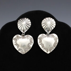Lovely heart earrings hand made out of sterling silver. The earrings have a hand stamped design and satin finish. Hand made by Navajo silversmith Vincent Platero. These fabulous earrings will become a versatile accessory in your jewelry collection. Weighs 10 grams. Signed. 1 1/16 x 1 7/8″ Artist...