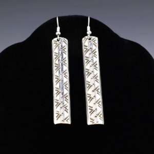 Outstanding earrings hand made out of sterling silver by Navajo artist Gabrielle Yazzie. Great stampwork with a satin finish. These wonderful earrings will become a versatile accessory in your jewelry collection. Weighs 14 grams. Signed 1 1/2” wide x 4 1/4” long Artist card included The Navajos began working with...