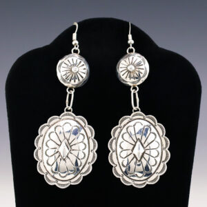 Lovely earrings hand made out of sterling silver. Hand made by Navajo silversmith Shami Willie. These fabulous earrings will become a versatile accessory in your jewelry collection. Weighs 10 grams. Signed 1 3/16″ x 1 7/8″ 2 1/2″ long (including ear wires) Artist card included The Navajos...