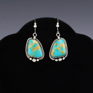 Lovely earrings hand made by Navajo silversmith Della Wylie. The earrings are sterling silver and set with Golden Hills Turquoise stones. These fabulous earrings will become a versatile accessory in your jewelry collection. Weighs 4 grams. Signed. 9/16″ x 11/16″ 1 3/8″ long (including ear wire) Artist card...