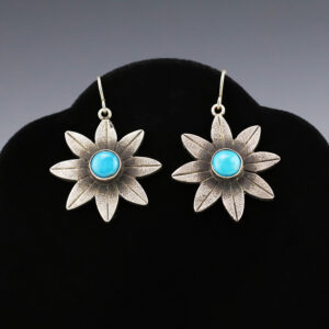 Stellar earrings hand made out of sterling silver and Turquoise. These fabulous earrings will become a versatile accessory in your jewelry collection. Weighs 2 grams. 5/8″ x 7/8″ 1 1/2″ long (including ear wires) The Navajos began working with silver in the 19th century, and began making...