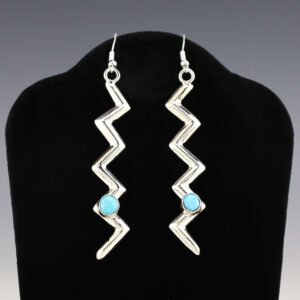 Gorgeous dangle earrings made out of sterling silver and set with Turquoise stones. Hand made by Navajo artist Erma Arviso. These fabulous earrings will become a versatile accessory in your jewelry collection. Weighs 4 grams. Signed 3/8″ x 13/16″ 1 1/4″ long (including ear wire) Artist card included...