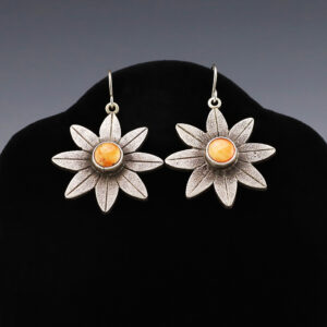 Beautiful squash blossom earrings hand made out of sterling silver with a satin finish. Hand made by Navajo silversmith Selena Warner. These fabulous earrings will become a versatile accessory in your jewelry collection. Weighs 4 grams. 7/16″ x 1 5/8″ Artist card included The Navajos began working with silver in...