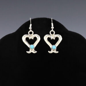 Beautiful heart earrings hand made out of sterling silver. Hand made by Navajo silversmith Jennie Blackgoat. These fabulous earrings will become a versatile accessory in your jewelry collection. Weighs 8 grams. Signed 1 1/4″ x 1 1/4″ 1 7/8″ long (including ear wires) Artist card included The Navajos began working...