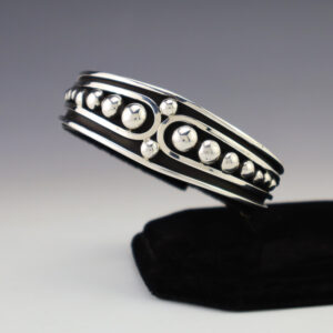Always in style, these bracelets look fabulous alone or stacked with other bracelets. Navajo jeweler Landon Secatero made this outstanding sterling silver bracelet. Weighs 44 grams. The entire inner circumference is about 6 3/4”, including 1 1/8” opening. (Fits a 6 3/4″ wrist). Signed. tapers 1/4″ to 1/2” wide Artist...