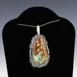 Beautiful pendant out of sterling silver and Number Eight Turquoise. A timeless beauty that you will enjoy for years to come. Weighs 16 grams. 1 1/16” wide x 2 1/8” long The Navajos began working with silver in the 19th century, and began making things like buckles,...