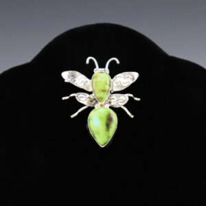 Navajo silversmith Lucille Platero made this fabulous Bee pin out of sterling silver and Sonoran Gold Turquoise. A timeless beauty that you will enjoy for years to come. Weighs 6 grams. 1 3/16” wide x 1 1/2” long Artist card included The Navajos began working with silver...