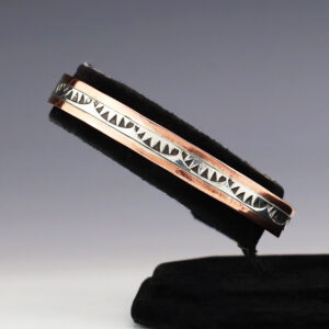 Navajo artist Wylie Secatero made this marvelous bracelet. Sterling silver and Copper with a traditional hand stamped design. Weighs 40 grams. The entire inner circumference is about 6 3/8”, including 1 1/16” opening. (Fits a 6 3/8″ wrist). Signed 3/8″ wide Artist card included The Navajos began...