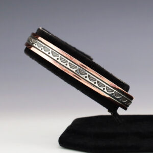 Navajo artist Wylie Secatero made this stellar bracelet. Sterling silver and Copper with a traditional hand stamped design. Weighs 18 grams. The entire inner circumference is about 6 3/4”, including 1 1/16” opening. (Fits a 6 3/4″ wrist). Signed 5/16″ wide Artist card included The Navajos began...