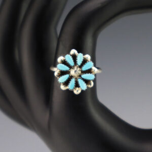 Zuni artists David and Sarita Leekity hand made this lovely ring out of sterling silver and Turquoise. Great petit point design! Weighs 4 grams. Size 7. 5/8″ in diameter Artist card included Zuni Pueblo is the largest pueblo in New Mexico, and because of its location, Zuni...