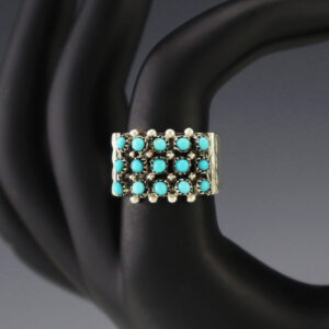 Fine channel inlay work. Zuni jewelry makers, Nancy and Sheldon Westika hand crafted this stunning ring. Sterling silver and inlaid with natural Turquoise. Zuni artists are known for their lapidary work. The Westikas have been making jewelry since the 1970’s and they are known for their fine inlay work. Signed. ...