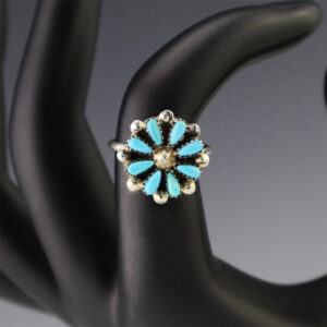 Zuni artists David and Sarita Leekity hand made this lovely ring out of sterling silver and Turquoise. Great petit point design! Weighs 4 grams. Size 5 3/4. 5/8″ in diameter Artist card included Zuni Pueblo is the largest pueblo in New Mexico, and because of its location,...