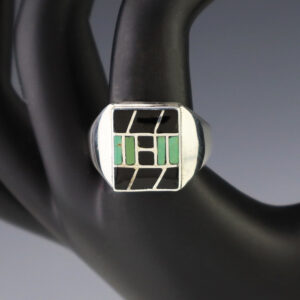 Zuni jewelry makers, Nancy and Sheldon Westika made this magnificent ring. Made out of sterling silver and inlaid with Jet. Zuni artists are known for their lapidary work. The Westikas have been making jewelry since the 1970’s and they are known for their fine inlay work. Signed. Weighs 4 grams. ...