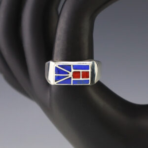 Zuni artists Nancy and Sheldon Westika made this magnificent ring. Made out of sterling silver and inlaid with Kingman Turquoise, Mother of Pearl Shell, Jet, and Coral. Zuni artists are known for their lapidary work. The Westikas have been making jewelry since the 1970’s and they are known for their...