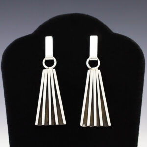 Outstanding dangle earrings hand made out of sterling silver by Navajo silversmith Dakota Willie. These fabulous earrings will become a versatile accessory in your jewelry collection. Weighs 10 grams. Signed 1/2″ x 2 1/4″ 2 11/16″ long (including ear wires) Artist card included The Navajos began working...