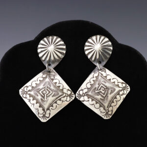 Lovely earrings hand made out of sterling silver with a stamped design and a satin finish. These fabulous earrings will become a versatile accessory in your jewelry collection. Weighs 8 grams. Signed. 3/4″ x 3/4″ 1 3/8″ long (including ear wires) The Navajos began working with silver in...
