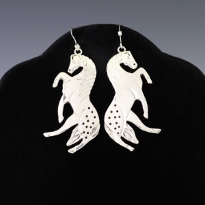 Marvelous horse earrings hand made out of sterling silver. Hand made by Navajo silversmith Robert Gene. These fabulous earrings will become a versatile accessory in your jewelry collection. Weighs 2 grams. Signed. 7/8″ x 5/8″ 1 1/4″ long (including ear wires) Artist card included The Navajos began...