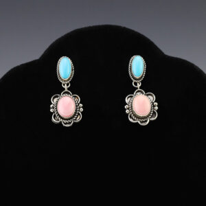 Lovely earrings hand made by Navajo silversmith Della Wylie. The earrings are sterling silver and set with Pink Conch and Turquoise stones. These fabulous earrings will become a versatile accessory in your jewelry collection. Weighs 6 grams. Signed. 9/16″ x 1 5/16″ Artist card included ...