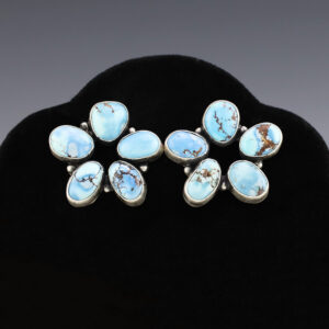 Gorgeous cluster earrings hand made by Navajo silversmith Rena Shelly. The earrings are sterling silver and set with Golden Hills Turquoise stones. These fabulous earrings will become a versatile accessory in your jewelry collection. Weighs 18 grams. Signed. 1 5/16″ x 1 3/16″ Artist card included The...