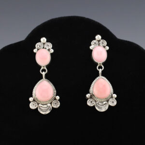 Beautiful earrings hand made out of sterling silver and Pink Conch by Navajo silversmith Mekechto Jim. These wonderful earrings will become a versatile accessory in your jewelry collection. Weighs 14 grams. 1 1/8″ x 1 5/16″ With ear wires are 1 15/16” in length Artist card included...