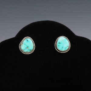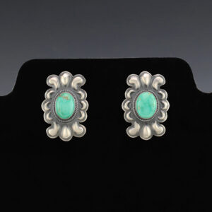 Beautiful post earrings hand made by Navajo silversmith Tawney Willie. The earrings are sterling silver and set with New Lander Variscite stones. These fabulous earrings will become a versatile accessory in your jewelry collection. Weighs 16 grams. Signed. 13/16″ x 1 5/16″ Artist card included The Navajos...