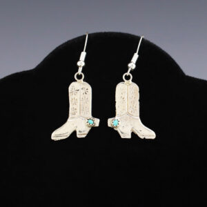 Gorgeous earrings hand made out of sterling silver and Golden Hills Turquoise. Hand made by Navajo silversmith Charmayne Charley. These fabulous earrings will become a versatile accessory in your jewelry collection. Weighs 16 grams. Signed. 9/16″ x 3″ Artist card included The Navajos began working with silver...