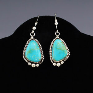 Lovely dangle earrings hand made by Navajo silversmith Rena Shelly. The earrings are sterling silver and set with Sonoran Turquoise stones. These fabulous earrings will become a versatile accessory in your jewelry collection. Weighs 14 grams. Signed. 1/2″ x 2 1/8″ Artist card included The Navajos began...