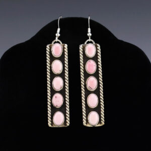 Beautiful earrings hand made out of sterling silver and Pink Conch by Navajo silversmiths Melvin and Tiffany Jones. These wonderful earrings will become a versatile accessory in your jewelry collection. Weighs 16 grams. Signed 1/2″ wide x 2 1/8″ long With ear wires are 2 3/4” in length...