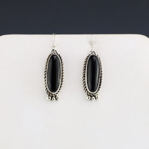 Beautiful earrings hand made out of sterling silver and Onyx by Navajo silversmith Priscilla Smith. These wonderful earrings will become a versatile accessory in your jewelry collection. Weighs 8 grams. Signed 1/2″ wide x 1 3/16″ long With ear wires are 1 5/8” in length Artist card...