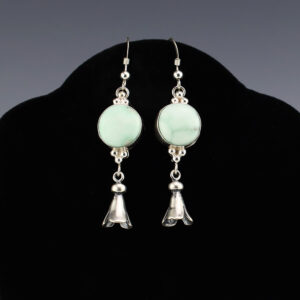 Lovely earrings hand made out of sterling silver and New Lander Variscite by Navajo artist Renell Perry. These fabulous earrings will become a versatile accessory in your jewelry collection. Weighs 6 grams. Signed 5/8″ x 1 5/16″ Artist card included The Navajos began working with silver in...