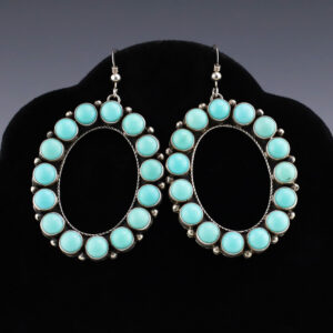 Lovely concho earrings hand made by Navajo artist Dale Morgan. The earrings are sterling silver and set with Turquoise stones. These fabulous earrings will become a versatile accessory in your jewelry collection. Weighs 22 grams. Signed. 1 5/8″ x 2 1/16″ 2 9/16″ long (including ear wire) Artist...