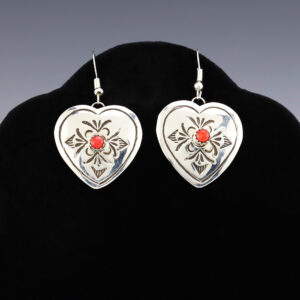NAVAJO STERLING SILVER & CORAL HEART EARRINGS JENNIE BLACKGOAT