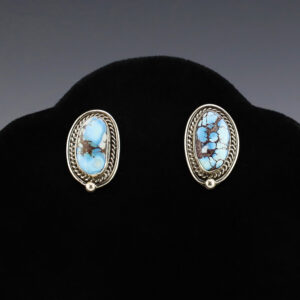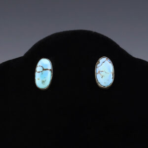 Beautiful post earrings hand made by Navajo silversmith Tawney Willie. The earrings are sterling silver and set with Tyrone Turquoise stones. These fabulous earrings will become a versatile accessory in your jewelry collection. Weighs 16 grams. Signed. 15/16″ x 1 1/16″ Artist card included The Navajos began...