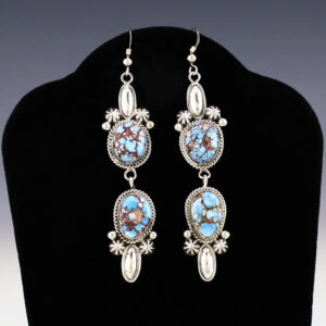 Fabulous earrings hand made out of sterling silver and Turquoise by Navajo artist Tim Yazzie. Great repousee design and satin finish! These fabulous earrings will become a versatile accessory in your jewelry collection. Weighs 10 grams. Signed 1 7/16″ wide x 2 1/2″ long Artist card included The Navajos began...