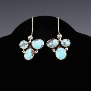 Gorgeous dangle earrings made out of sterling silver and set with Campitos Turquoise stones. Hand made by Navajo artist Renell Perry. These fabulous earrings will become a versatile accessory in your jewelry collection. Weighs 18 grams. Signed. 1 7/16″ x 1 7/8″ 2 1/2″ long (including ear wire) ...