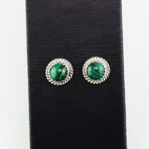Lovely earrings hand made out of sterling silver and Malachite by Navajo silversmith Theresa Kinsel. These wonderful earrings will become a versatile accessory in your jewelry collection. 3/8″ x 3/8″ Artist card included The Navajos began working with silver in the 19th century, and began making things...
